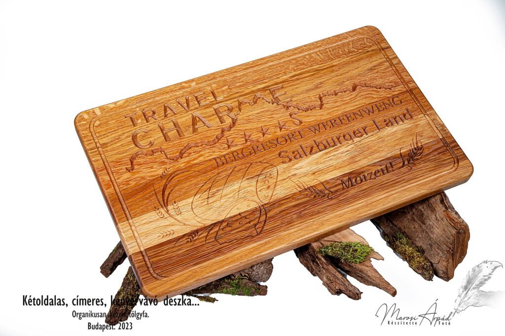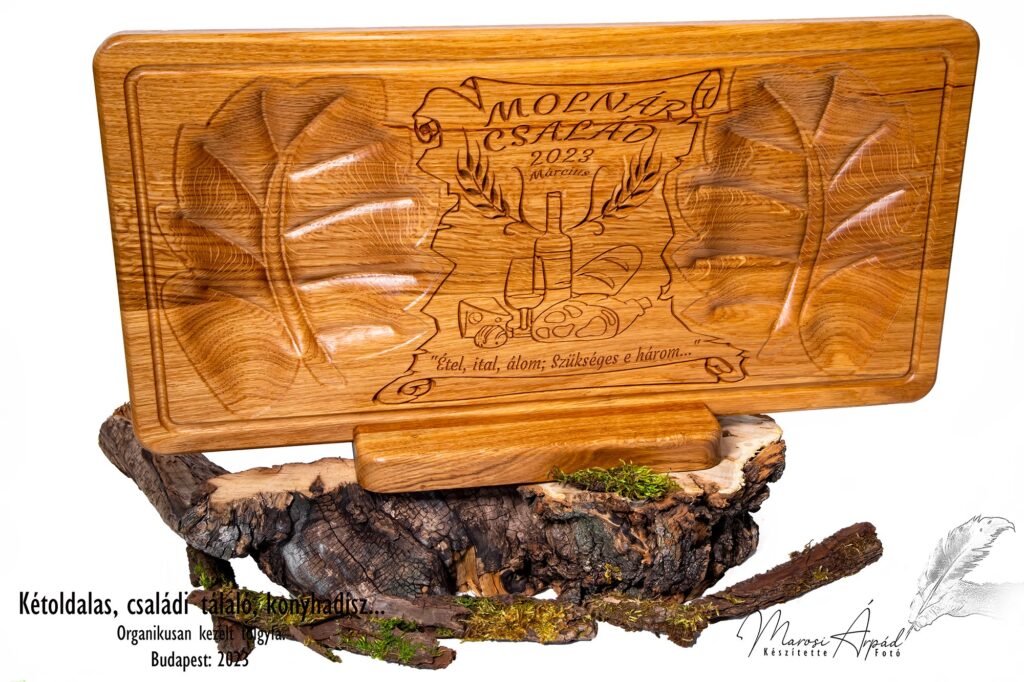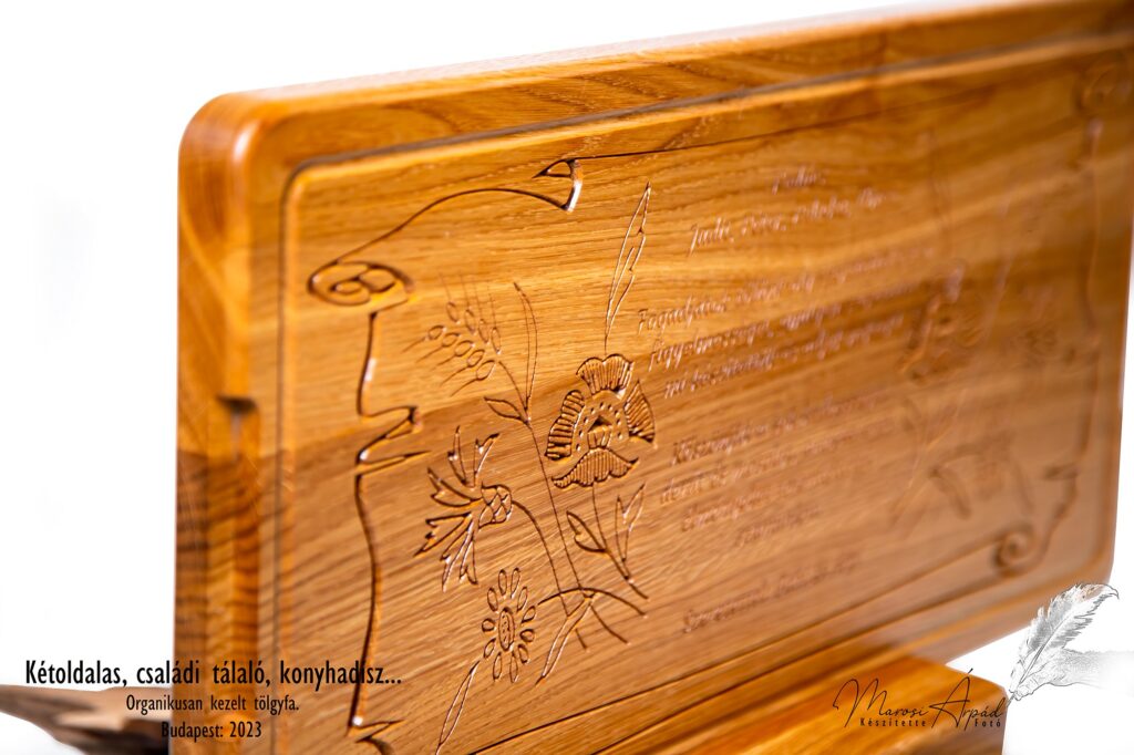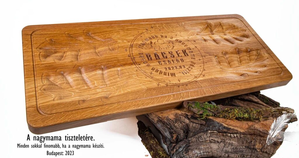 A vágódeszkák általában masszív tölgy- vagy bükkfából készülnek; nagy méretüknek köszönhetően egyszerre praktikusak és látványosak is. Egy-egy ilyen deszka 4-6 személyes tálalásra is elegendő, és erejük, tartósságuk révén akár több generáción át szolgálhatnak. A széleken gravírozott díszítés fut végig, míg a középső rész díszes, az ajándékozott igényeire szabott motívummal készül – de ha valaki inkább használatra szánja, a középrész gravírozás nélkül is kérhető, hogy bátran szeletelhess, tálalhass rajta a mindennapokban.