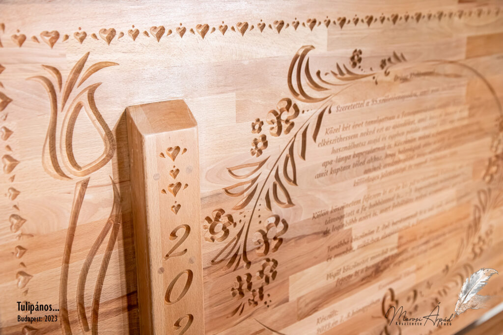 A munkáját egyre több elismerés és dicséret övezte, mígnem azon kaptuk magunkat, hogy a famegmunkálás az egyik legfontosabb hobbija és szabadidős tevékenysége lett. Másfél–két év tanulás, tapasztalat és kitartás után elém tett egy gyönyörű tervet – a születendő tulipánosládám részleteivel, minden apró finomsággal és egy hatalmas lelkesedéssel körbevéve.