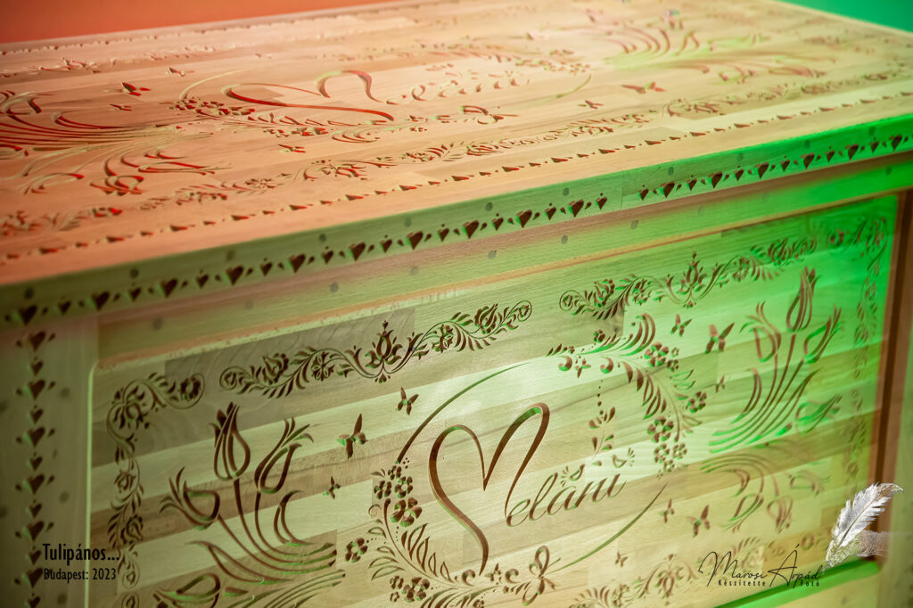 A láda anyaga válogatott európai bükk, melyet kiemelkedő alapossággal és különleges figyelemmel munkált meg mintegy két hónap alatt. Minden részletében ott az egyediség: a szívből jövő gondosság, a jellegzetes tulipánmotívumok, az aprólékos díszítés, a titkos rekesz és a ládafia, amelyek mind hozzájárulnak ahhoz, hogy ez a bútordarab valóban különlegessé váljon.